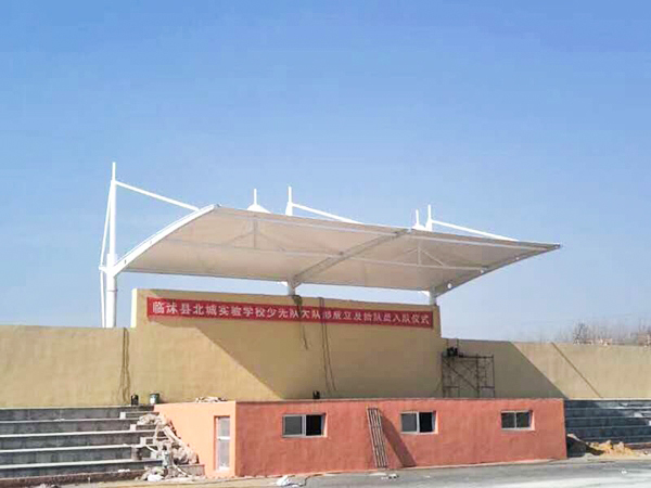 膜结构主要用于体育设施,在学校操场的体育看台或领奖台的屋顶。膜结构屋顶在大型体育场馆中也并不少见。一般的立柱形态由贝壳状的峰膜和端部张力膜组成,新颖活泼。钢架、索、膜巧妙组合,由膜、膜边索、脊索、谷索、索、杆及一定格梁稳定。膜的顶部过渡流畅,结构美观、轻巧,整体造型相互辉映,独树一帜。