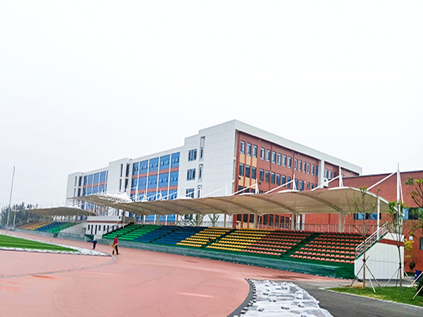 膜结构主要用于体育设施,在学校操场的体育看台或领奖台的屋顶。膜结构屋顶在大型体育场馆中也并不少见。一般的立柱形态由贝壳状的峰膜和端部张力膜组成,新颖活泼。钢架、索、膜巧妙组合,由膜、膜边索、脊索、谷索、索、杆及一定格梁稳定。膜的顶部过渡流畅,结构美观、轻巧,整体造型相互辉映,独树一帜。