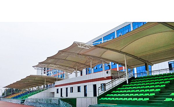 膜结构主要用于体育设施,在学校操场的体育看台或领奖台的屋顶。膜结构屋顶在大型体育场馆中也并不少见。一般的立柱形态由贝壳状的峰膜和端部张力膜组成,新颖活泼。钢架、索、膜巧妙组合,由膜、膜边索、脊索、谷索、索、杆及一定格梁稳定。膜的顶部过渡流畅,结构美观、轻巧,整体造型相互辉映,独树一帜。