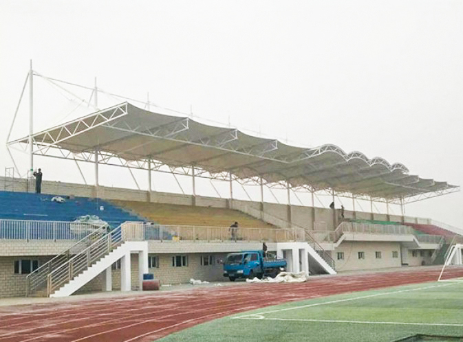 膜结构主要用于体育设施,在学校操场的体育看台或领奖台的屋顶。膜结构屋顶在大型体育场馆中也并不少见。一般的立柱形态由贝壳状的峰膜和端部张力膜组成,新颖活泼。钢架、索、膜巧妙组合,由膜、膜边索、脊索、谷索、索、杆及一定格梁稳定。膜的顶部过渡流畅,结构美观、轻巧,整体造型相互辉映,独树一帜。