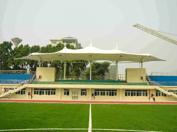 膜结构主要用于体育设施,在学校操场的体育看台或领奖台的屋顶。膜结构屋顶在大型体育场馆中也并不少见。一般的立柱形态由贝壳状的峰膜和端部张力膜组成,新颖活泼。钢架、索、膜巧妙组合,由膜、膜边索、脊索、谷索、索、杆及一定格梁稳定。膜的顶部过渡流畅,结构美观、轻巧,整体造型相互辉映,独树一帜。