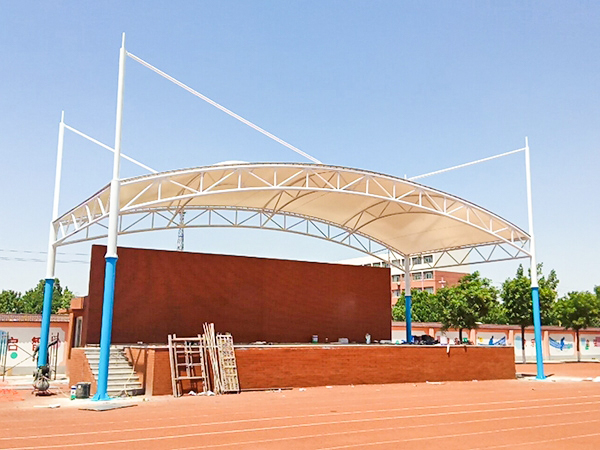 膜结构主要用于体育设施,在学校操场的体育看台或领奖台的屋顶。膜结构屋顶在大型体育场馆中也并不少见。一般的立柱形态由贝壳状的峰膜和端部张力膜组成,新颖活泼。钢架、索、膜巧妙组合,由膜、膜边索、脊索、谷索、索、杆及一定格梁稳定。膜的顶部过渡流畅,结构美观、轻巧,整体造型相互辉映,独树一帜。