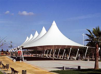 膜结构景观棚的稳定性取决于膜表面预张力的保持。预紧力的大小影响膜在荷载作用下的变形程度。如果预紧力过小,膜在风荷载作用下会发生较大的变形,颤振发生。如果荷载持续时间较长,膜会松弛和蠕变,因此膜表面的预应力在使用过程中会发生变化。膜结构景观棚的膜材性能可以通过双轴试验来确定。如果预紧力过低,则需要保持预紧力以恢复其预紧力。
