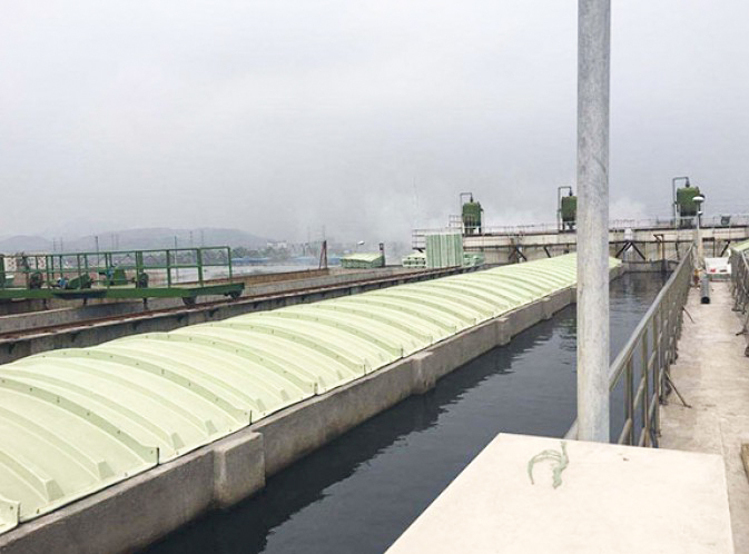 由于工业技术的不断进步,污水池加盖由传统的加盖方式演变为膜结构形式的加盖,在污水池上方增设膜结构,此时污水池中产生的废气与空气隔绝,在防护罩表面增设出气口,并安装通风管道,废气由通风管道进入废气净化塔,为加大废气收集,在净化塔前安装玻璃钢风机,由风机将废气吸入净化塔,废气在塔内经两级喷淋,若废气呈酸性则采用碱液循环吸收,若废气呈碱性则采用酸液循环喷淋吸收,废气处理效率达90%以上,排放达到国家有关标准。
