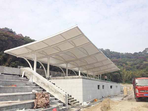 膜结构主要用于体育设施,在学校操场的体育看台或领奖台的屋顶。膜结构屋顶在大型体育场馆中也并不少见。一般的立柱形态由贝壳状的峰膜和端部张力膜组成,新颖活泼。钢架、索、膜巧妙组合,由膜、膜边索、脊索、谷索、索、杆及一定格梁稳定。膜的顶部过渡流畅,结构美观、轻巧,整体造型相互辉映,独树一帜。