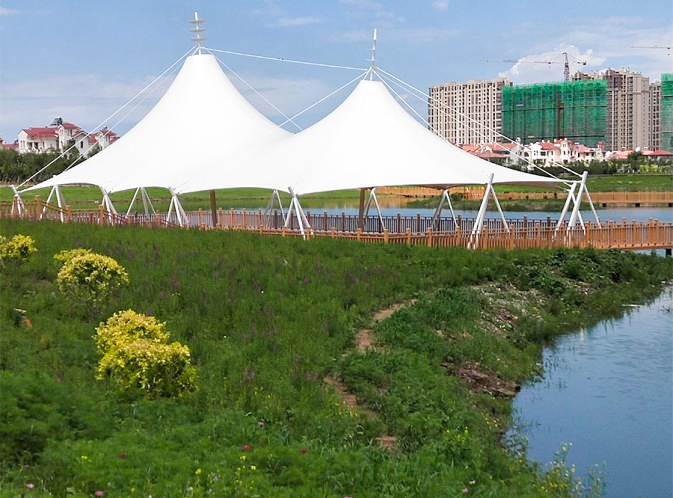 膜结构景观棚膜表面污垢的堆积与当地环境条件、膜材料特性和景观形态有关。从技术角度看,膜结构景观棚不一定需要清洗。对于大多数膜材料,清洗并不能延长其使用寿命。反之,清洗不当也会缩短其使用寿命。