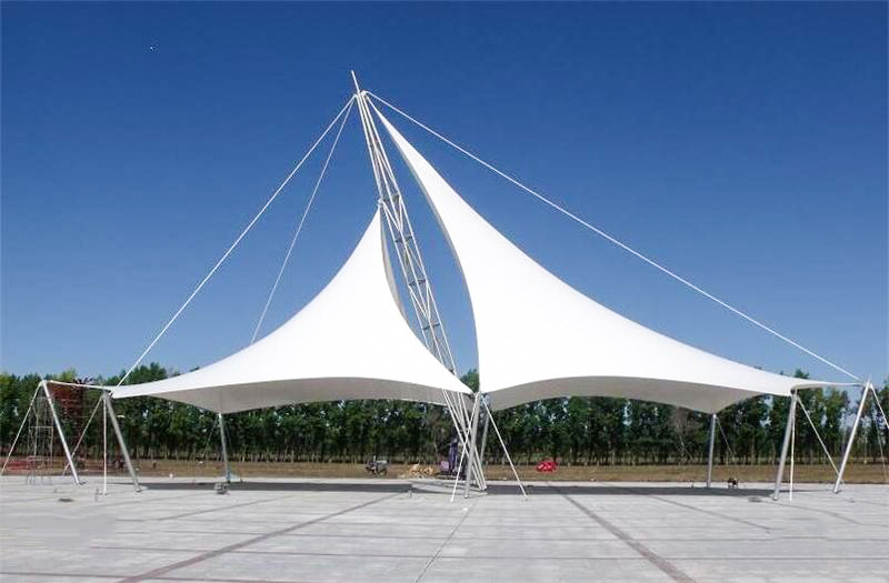 膜结构景观棚的稳定性取决于膜表面预张力的保持。预紧力的大小影响膜在荷载作用下的变形程度。如果预紧力过小,膜在风荷载作用下会发生较大的变形,颤振发生。如果荷载持续时间较长,膜会松弛和蠕变,因此膜表面的预应力在使用过程中会发生变化。膜结构景观棚的膜材性能可以通过双轴试验来确定。如果预紧力过低,则需要保持预紧力以恢复其预紧力。