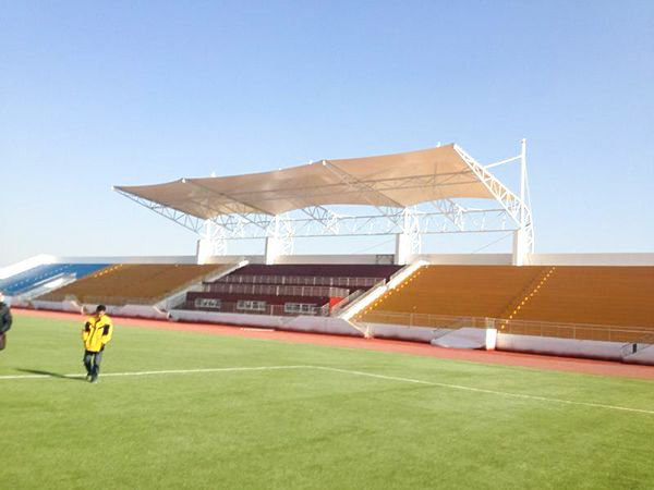 膜结构主要用于体育设施,在学校操场的体育看台或领奖台的屋顶。膜结构屋顶在大型体育场馆中也并不少见。一般的立柱形态由贝壳状的峰膜和端部张力膜组成,新颖活泼。钢架、索、膜巧妙组合,由膜、膜边索、脊索、谷索、索、杆及一定格梁稳定。膜的顶部过渡流畅,结构美观、轻巧,整体造型相互辉映,独树一帜。