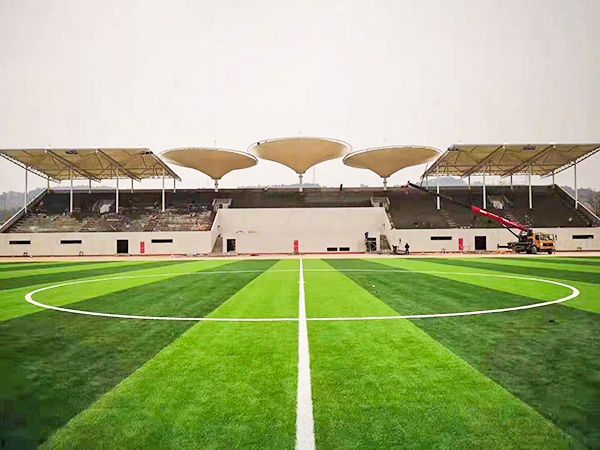膜结构主要用于体育设施,在学校操场的体育看台或领奖台的屋顶。膜结构屋顶在大型体育场馆中也并不少见。一般的立柱形态由贝壳状的峰膜和端部张力膜组成,新颖活泼。钢架、索、膜巧妙组合,由膜、膜边索、脊索、谷索、索、杆及一定格梁稳定。膜的顶部过渡流畅,结构美观、轻巧,整体造型相互辉映,独树一帜。